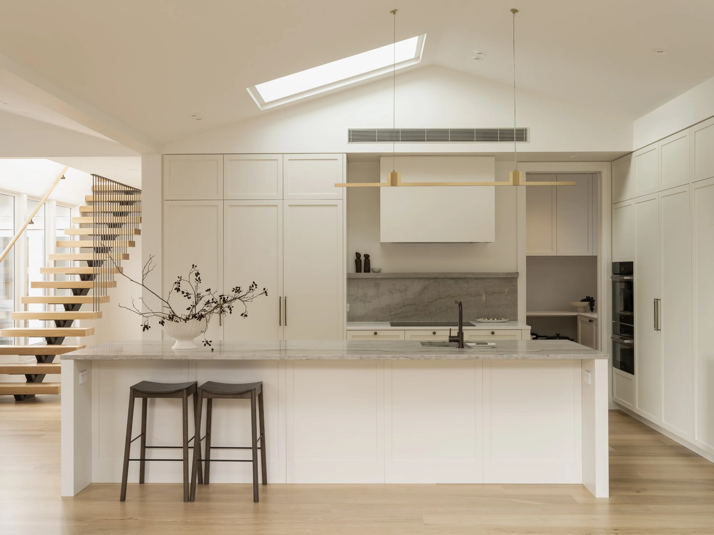 We undertook the full specification and design of the interiors for this home including all custom cabinetry for the kitchen, scullery, laundry, bathrooms and living areas. The interior direction was sympathetic to the architecture through the incorporation of shaker panelling and subtle use of colour and natural finishes.